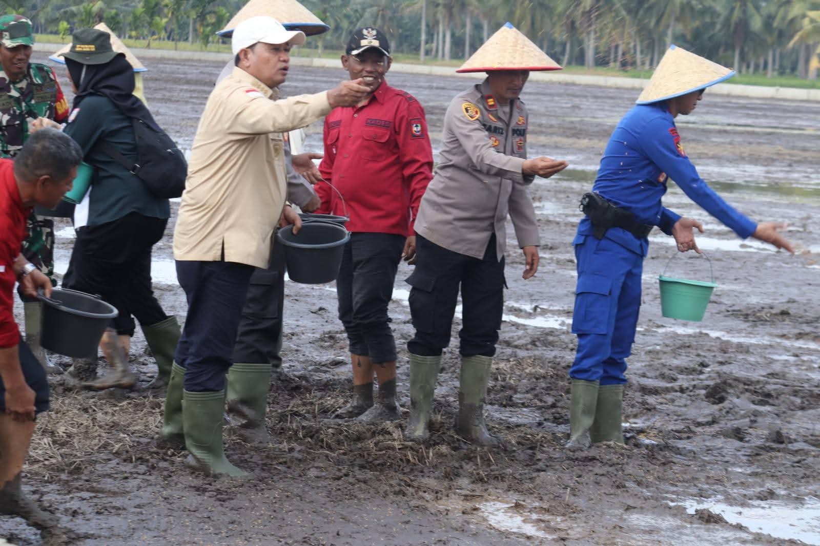 Tebarkan – Karang Agung Ilir — Bupati Banyuasin, Dr. H. Askolani, SH., MH dan Wakil Bupati Banyuasin, Netta Indian, SP bersama Kapolres Banyuasin, AKBP. Ruri Prastowo SH SIK MIK melakukan Tabur Benih IP 300 perdana di Kabupaten Banyuasin di Desa Mekar Sari Kecamatan Karang Agung Ilir, Jum’at (25/07/2025).