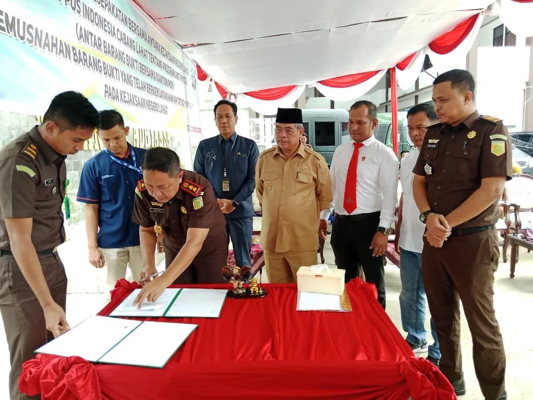 TEBARKAN – LAHAT – Bupati Lahat Bursah Zarnubi menghadiri kegiatan Penandatanganan Perjanjian Kerjasama Pengantaran Barang Bukti antara Kejaksaan Negeri dengan PT.Pos Indonesia Cabang Lahat dan Kegiatan Pemusnahan Barang Bukti Perkara Tindak Pidana Umum. Senin ( 28/04/2025 ), bertempat di Halaman Kejaksaan Negeri Lahat.