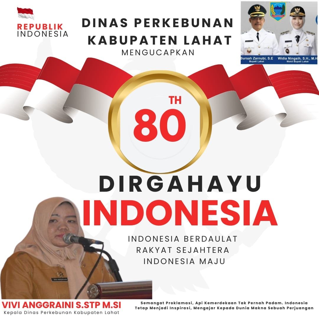 Dinas Perkebunan Kabupaten Lahat Mengucapkan HUT RI ke-80 admin17/08/202518/08/202570 Dilihat Vivi Anggraini, S.STP,. M.Si Kepala Dinas Perkebunan Kabupaten Lahat Post Views: 70 Pos terkaitBupati Mura Hj. Ratna Machmud Menyerakan Bantuan Alsintan Traktor Roda 4 dan Traktor Roda 2DPRD Gelar Paripurna Rancangan KUA dan PPAS Kabupaten Lahat TA 2026Dukung Kewirausahaan Kalangan Pengusaha Muda Wabup LahatParipurna ke-4 DPRD Lahat Bahas KUA–PPAS APBD 2026Konser Amal Lahat Untuk Korban Banjir Sumatera di Meriahkan SAFA KDIKadis Diknasbud Niel Aldrin dan Guru Se-Kabupaten Lahat Ajak Masyarakat Dukung dan Vote SAFA KDI Menangkan Putri Terbaik Lahat”