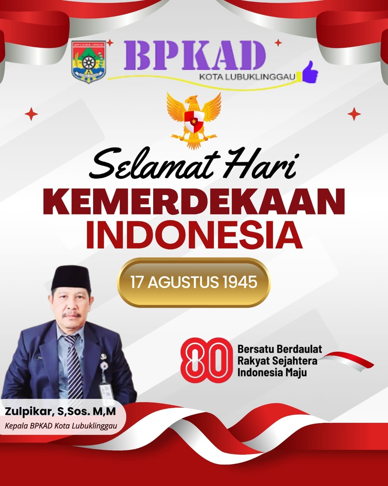Kepala BPKAD Kota Lubuklinggau Mengucapkan Dirgahayu RI ke-80 admin17/08/202518/08/2025124 Dilihat Kepala BPKAD Kota Lubuklinggau Zulpikar, S.Sos,. MM Post Views: 124 Pos terkaitWali Kota Lubuk Linggau H Rachmat Hidayat Sholat Tarawih di Masjid Al Ma’rufWali Kota Lubuklinggau Safari Jumat di Masjid Al-Latif Sumber AgungParipurna DPRD Lubuk linggau Penetapan Propemperda 2026 Penandatanganan Persetujuan Bersama Wali Kota dan DPRDWalikota Lubuklinggau H. Rachmat Hidayat Kukuhkan Pemangku Adat KelurahanUpacara Memperingati HGN dan HUT PGRI Ke-80 di Pimpin Wakil Bupati SuprayitnoWali Kota Lubuklinggau Hadiri Gala Dinner Sriwijaya Ranau Gran Fondo VII Tahun 2025, Rangkaian Festival Danau Ranau 2025