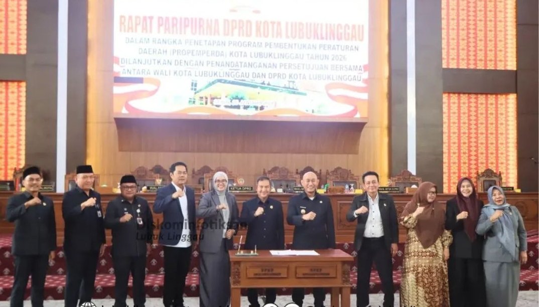TEBARKAN – LUBUK LINGGAU – Rapat Paripurna DPRD Kota Lubuk Linggau dalam rangka penetapan Program Pembentukan Peraturan Daerah (Propemperda) Kota Lubuk Linggau Tahun 2026, dilanjutkan dengan penandatanganan persetujuan bersama antara Wali Kota dan DPRD Kota Lubuk Linggau dihadiri Wali Kota Lubuk Linggau, H Rachmat Hidayat, Senin (26/1/2026).