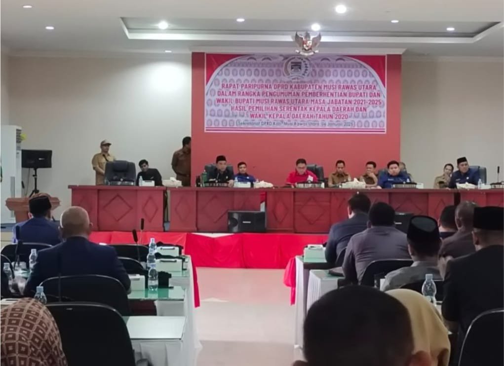 TEBARKAN.COM – MURATARA – Rapat paripurna Dewan Perwakilan Rakyat Daerah (DPRD) Kabupaten Musi Rawas Utara (Muratara) dengan agenda pengumuman pemberhentian Bupati dan Wakil Bupati Musi Rawas Utara masa jabatan 2021-2025 hasil Pemilihan Kepala Daerah (Pilkada) tahun 2020, Pada Senin (06/01/2025) di Ruang rapat Paripurna DPRD Muratara.