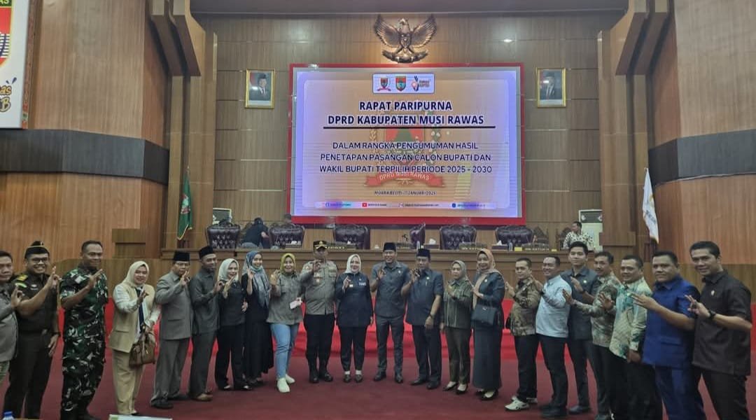TEBARKAN.COM – MUSI RAWAS – Rapat Paripurna Dewan Perwakilan Rakyat Daerah (DPRD) Kabupaten Musi Rawas agenda pengumuman penetapan calon Bupati dan Wakil Bupati Musi Rawas terpilih periode 2025 – 2030, Hj Ratna Machmud – H Suprayitno, SH.
