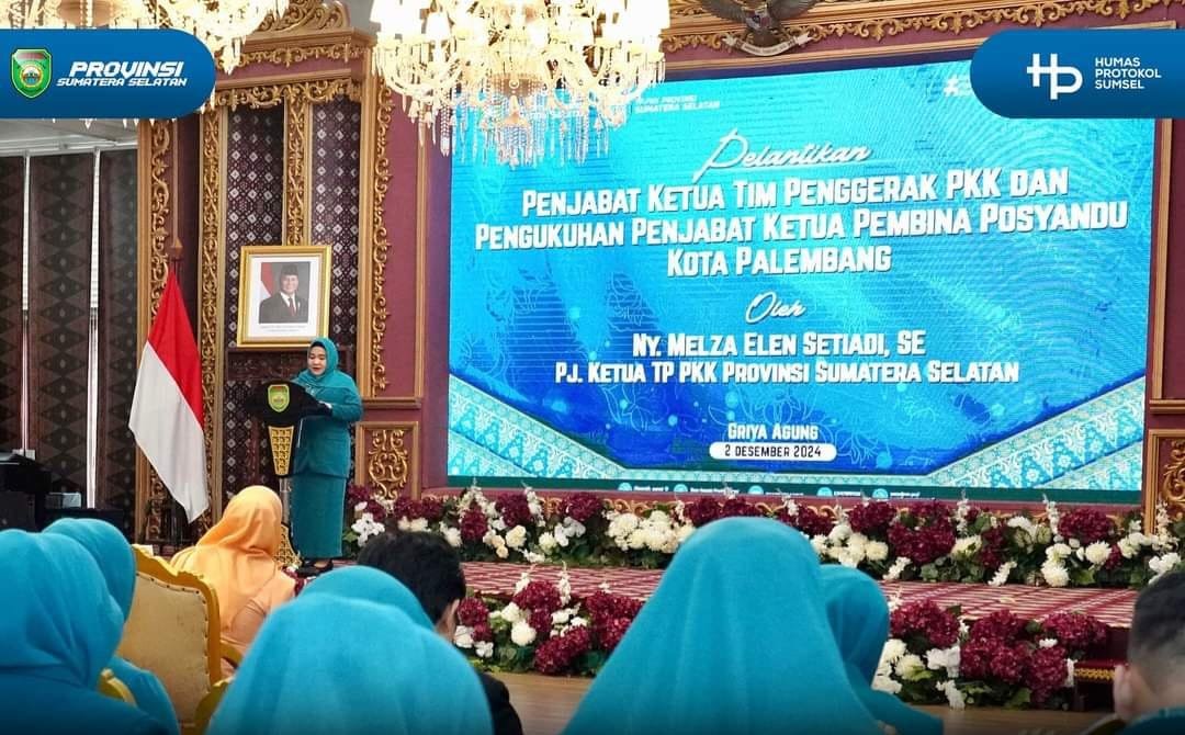 TEBARKAN.COM – PALEMBANG – Penjabat (Pj) Ketua Tim Penggerak (TP) Pemberdayaan Kesejahteraan Keluarga (PKK) Provinsi Sumatera Selatan (Sumsel) Melza Elen Setiadi melantik sekaligus mengukuhkan Dwi Wahyuni Cheka sebagai Pj Ketua TP PKK Kota Palembang dan Ketua Pembina Posyandu kota Palembang dengan masa bakti sesuai masa jabatan Pj Walikota Palembang, bertempat di Griya Agung, Senin (2/12/2024).