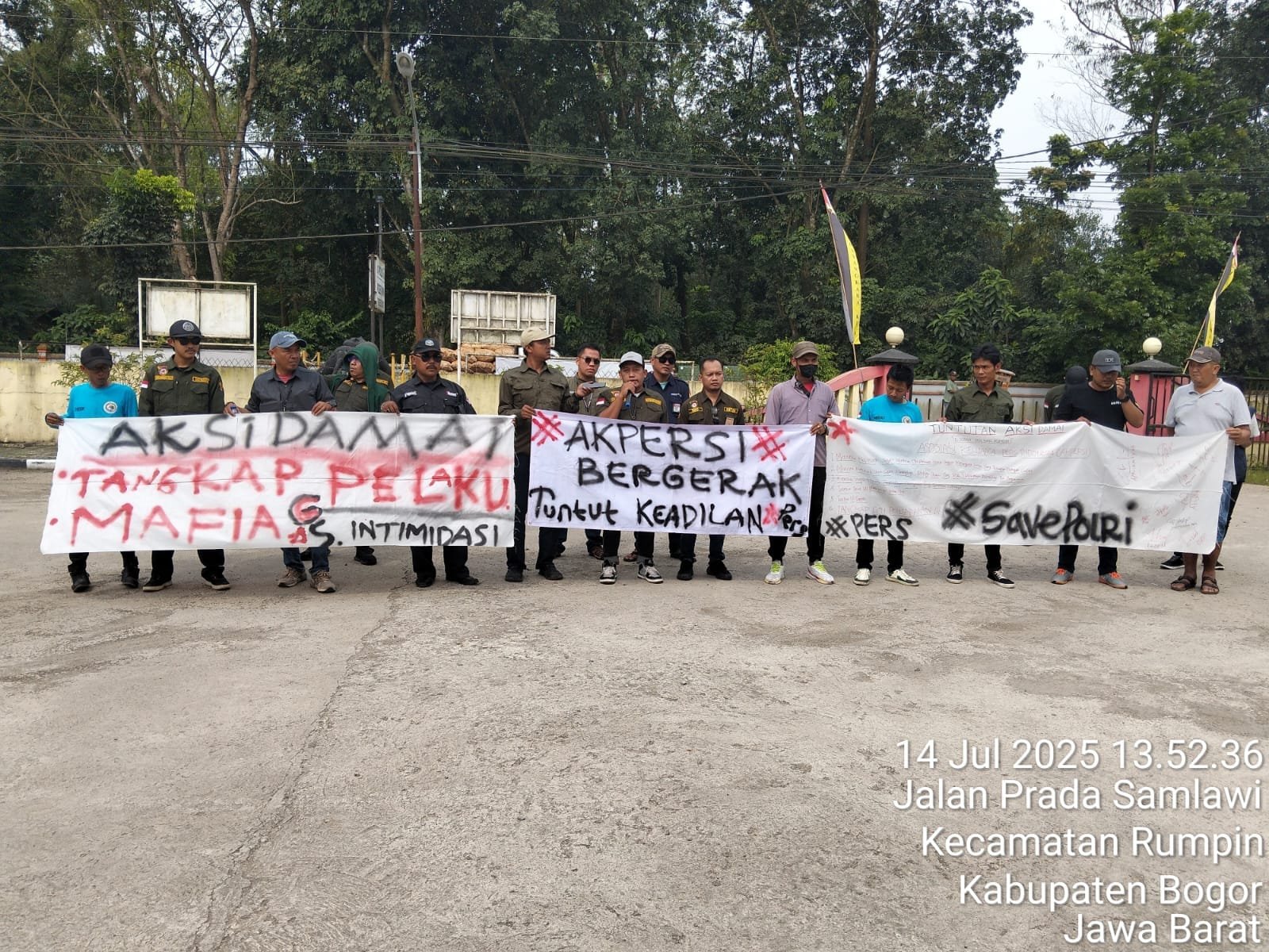 Bogor – Asosiasi Keluarga Pers Indonesia (AKPERSI) mengadakan Aksi Damai di depan Kepolisian Sektor (Polsek) Rumpin, Kabupaten Bogor, Jawa Barat, Meminta agar Kapolsek segera menangkap pelaku intimidasi dan pengancaman pembunuhan terhadap wartawan yang tergabung di AKPERSI pada saat liputan, Senin (14/07/25).